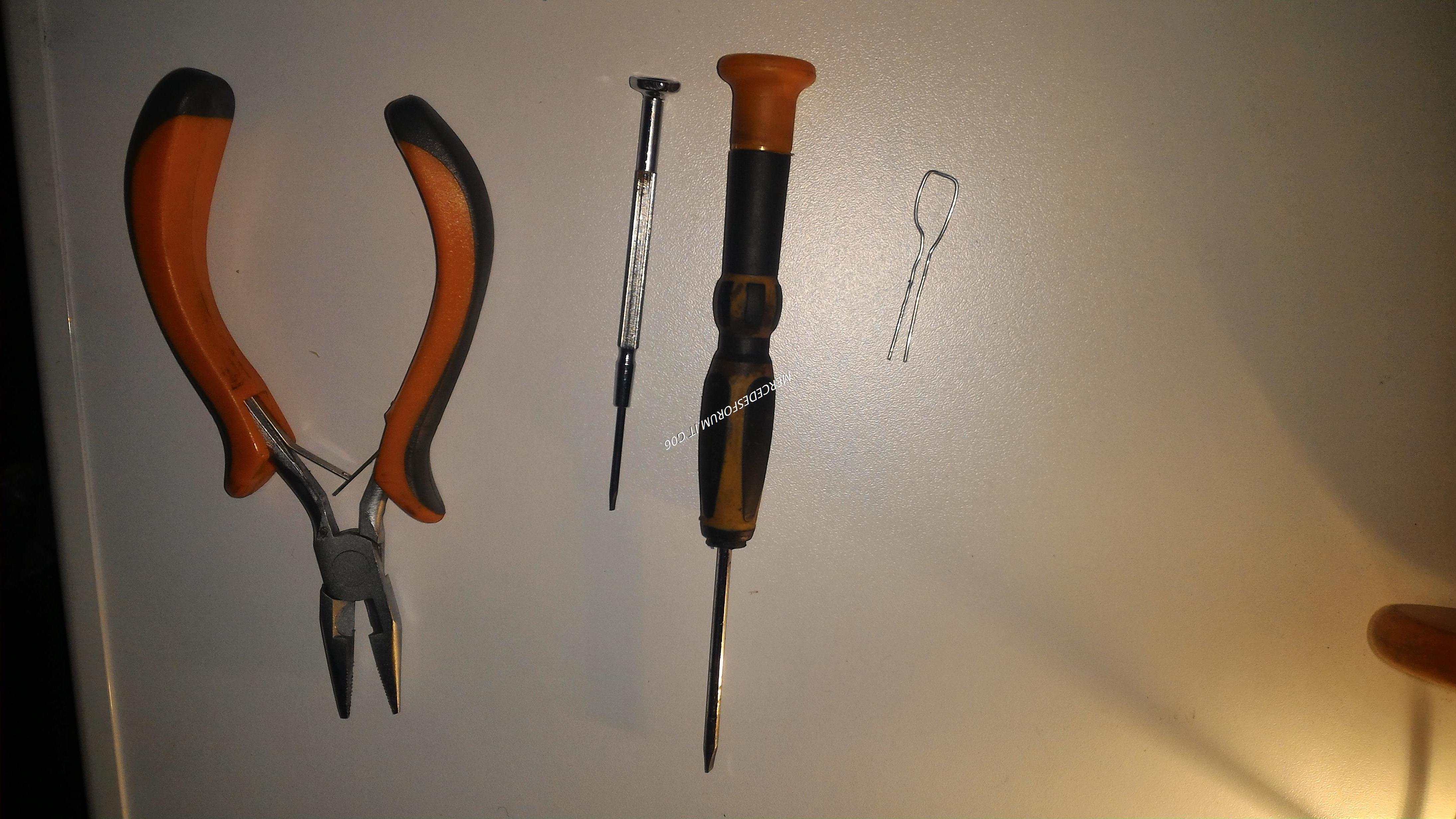 Ho usato , due cacciaviti a taglio piccoli , una pinza piccola , e un pezzo di fil di ferro :